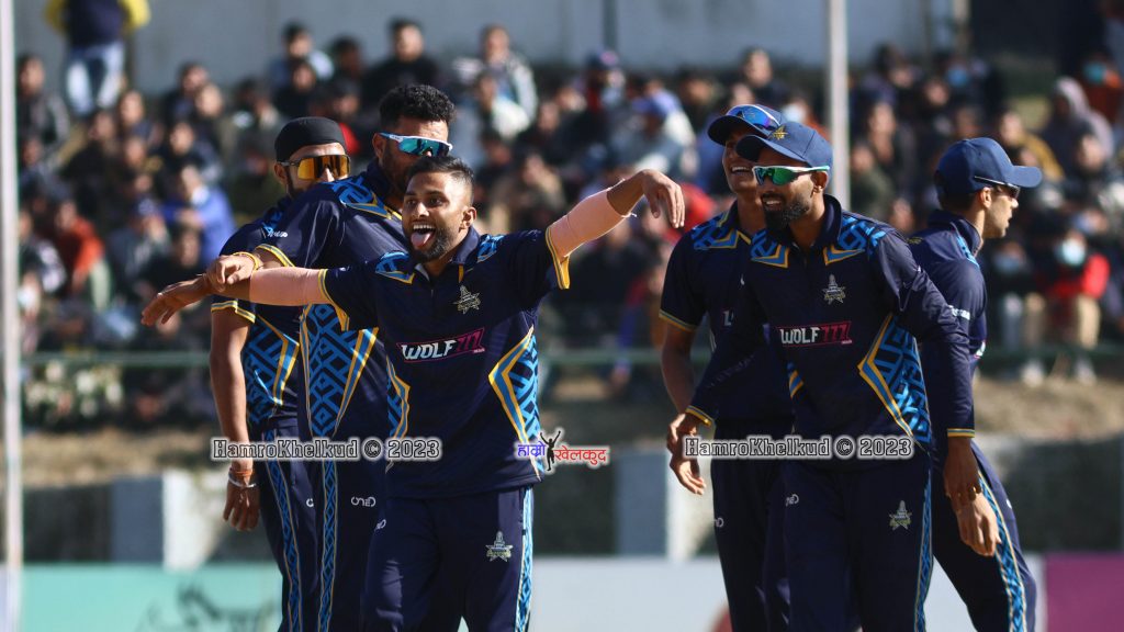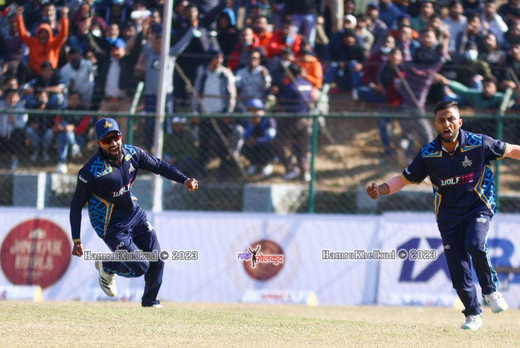 स्पिनर राज नान्ननको बलमा चोभार एण्डतर्फ ठूलो सट खेलेपनि गौरांशु शर्माले २० रनमा क्याच लिँदै पेभेलिएन फर्काए । ईशान पाण्डे १८, विपुल शर्मा ५, गुलशन झा ३, साड्ली भान स्केलक्किक १, अनिलकुमार शाह ८ र किशोर महतो २ रनमा आउट भए ।