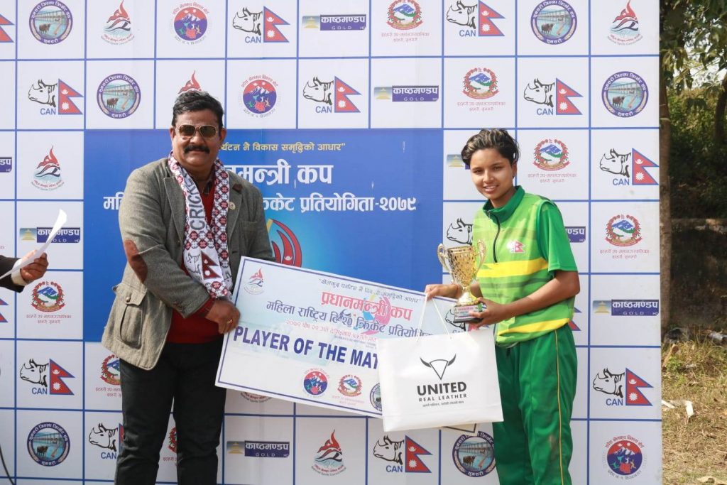 कविता जोशी १५ बलमा ४ चौका र २ छक्कासहित ३२ रनमा अविजित रहिन् । मधेशकी साना प्रविन र भूमि सिंहले एक एक विकेट लिए ।