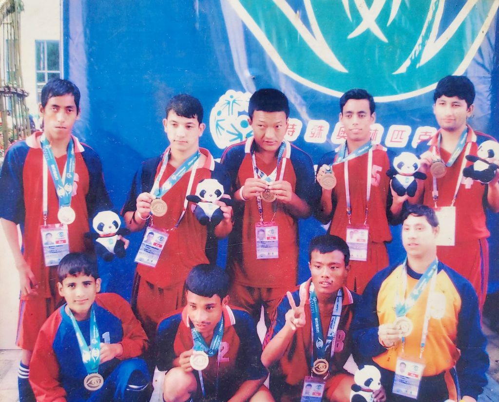 २००७ मा उनले चीनमा गएर विशेष ओलम्पिक विश्व ग्रीष्मकालिन खेल अन्तर्गत फुटबल खेले । सामान्य व्यक्तिजस्तै सानोमा नन्दु सबै खेल खेल्थे । तर ७–८ वर्षको उमेरमा कीर्तिपुर नयाँ बजार घर भएका उनी पाँच तलामाथिबाट खसेपछि केहि मानसिक असर परेको बताउँछन् । टियुमा खेल हुँदैछ भनेर उनी सामाजिक सञ्जाल र गुगलबाट थाहा पाउँछन् । खेल हेर्न नपाउँदा कहिलेकाहीँ क्यान, चिनेका मान्छे वा खेलाडीलाई सोध्छन् ।