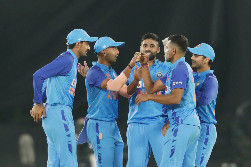 भारतका हार्दिक पान्ड्याले ४ ओभरमा १६ रन खर्चेर ४ विकेट लिए । अर्शदीप सिंहले ३ ओभरमा १६ रन खर्चेर २ विकेट लिए । उमरान मलिकले २.१ ओभरमा ९ रन खर्चेर २ विकेट लिए । शिवम माभीले २ ओभरमा १२ रन खर्चेर २ विकेट लिए ।