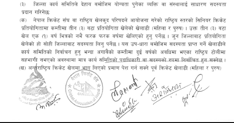 विधानमा भनिएको छ, ‘यस उपधारा बमोजिम सदस्यता प्राप्त गर्ने खेलाडीले कार्यसमितिको निर्वाचन हुनु भन्दा अगावै कम्तीमा दुई वर्षको अवधिमा भएको राष्ट्रिय टोलीमा सहभागीता नभएको अवस्थामा मात्र कार्य समितिको पदाधिकारी वा सदस्यको रुपमा निर्वाचन हुन सक्नेछ ।’
