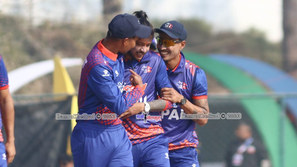 चोभार एन्डबाट आएका सन्दीपले आफ्नो स्पेलको दोस्रो बलमै विकेट लिँदै साझेदारी तोडेका थिए । सन्दीपले बलात्कार आरोप लागेपछि गत भदौपछि नेपाली टोलीमा पूनरागमन गरेका हुन् ।