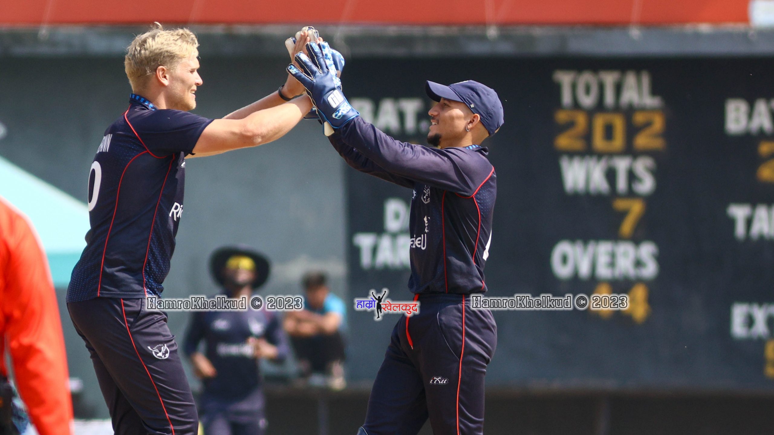 नेपालविरुद्ध सानदार शतक हानेका माइकल लिस्कलाई ट्रम्पलम्यानले ४५ औं ओभरको चौथो बलमा २९ रनमा बोल्ड गरेपछि स्कटल्यान्डको ठूलो योगफलको सम्भावना टाढिएको थियो । लिस्कले २६ बलमा १ चौका र २ छक्का हाने ।