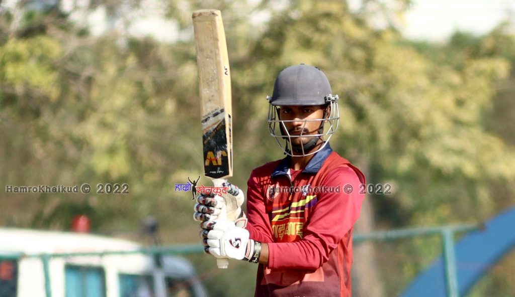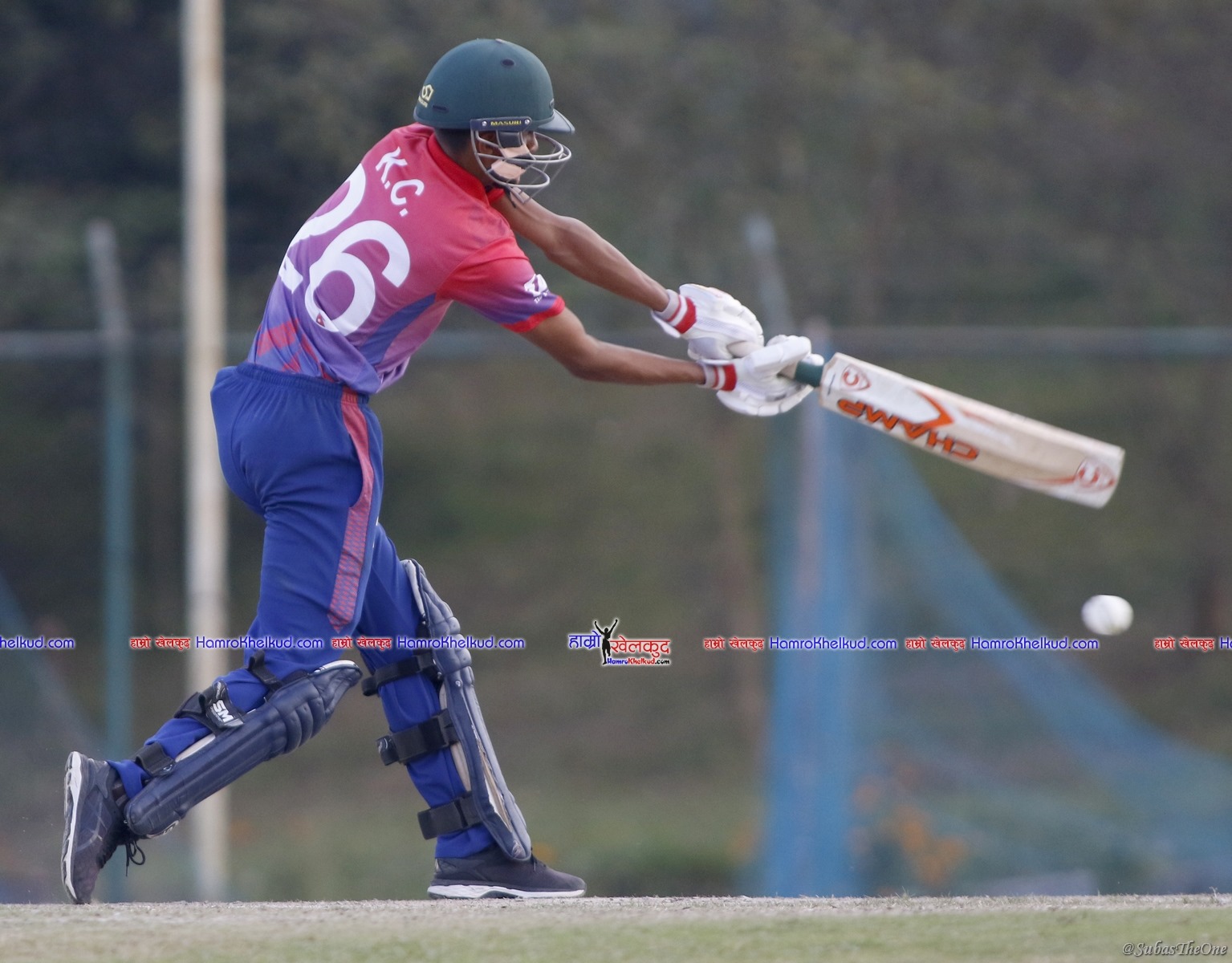 दोस्रो विकेटका लागि अर्जुन कुमाल र आकाशले ९३ रनको साझेदारी गर्दै राम्रो योगफलको आधार तय गरेका थिए । अर्जुन कुमाल ६७ बलमा ३ चौकासहित ३७ रन जोड्दै बोल्ड आउट भए । कप्तान देव खनाल पनि २६ बलमा १ चौकासहित २१ रनमा आउट भए । देव अभ्युदय छाजेरको बलमा एलबीडब्लू आउट भए ।