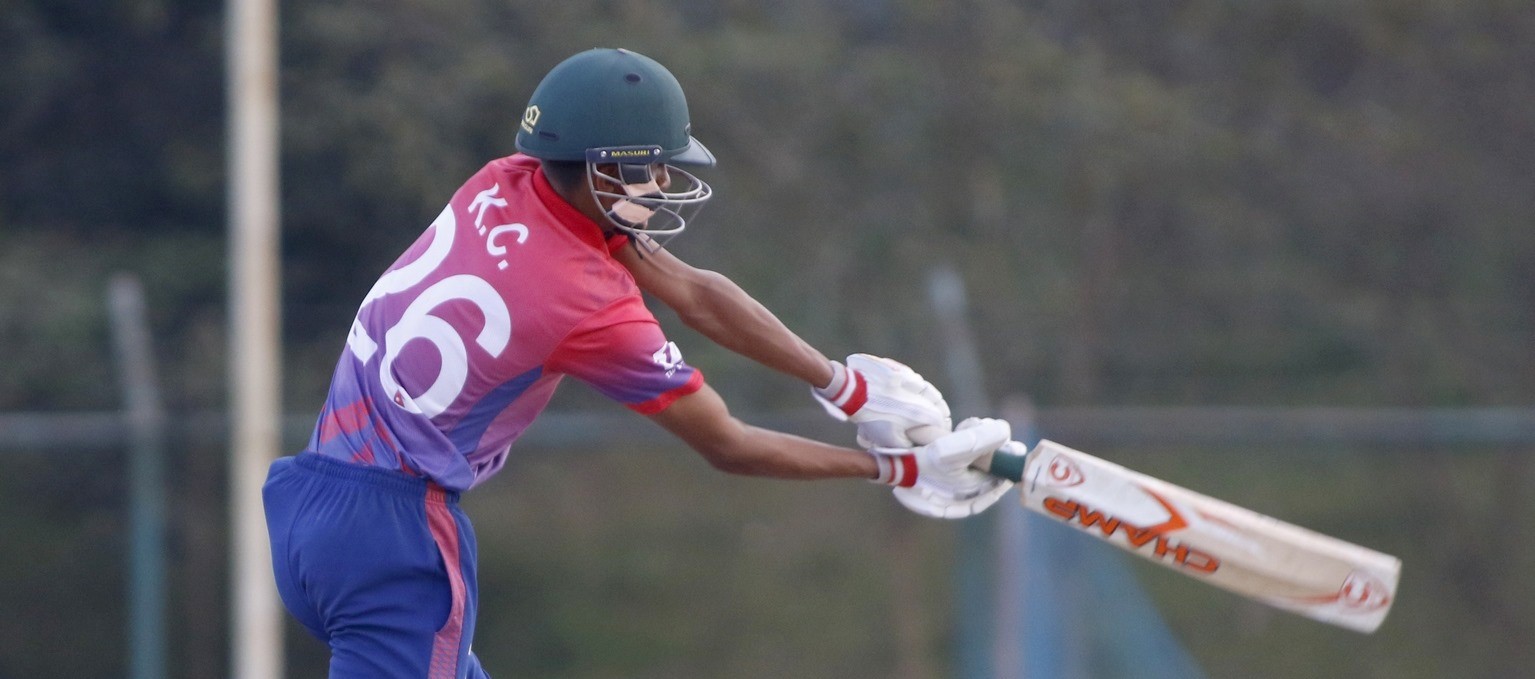 नेपालका मध्यक्रमका ब्याटर विशाल विक्रम केसी ५४ बलमा ४ चौका र २ छक्कासहित ६३ रनमा अविजित रहे । विशालले ४५ बलमा अर्धशतक पूरा गरेका थिए । २०१९ पछि यू१९ टोलीमा फर्किएका विशालले मध्यक्रममा भरपर्दो ब्याटिङ गर्दै बलियो योगफलको आधार तय गरे । विशालले २०१९ मा भारत भ्रमणमा रितको कप्तानीमा नेपाली यू१९ टोलीबाट खेलेका थिए ।
