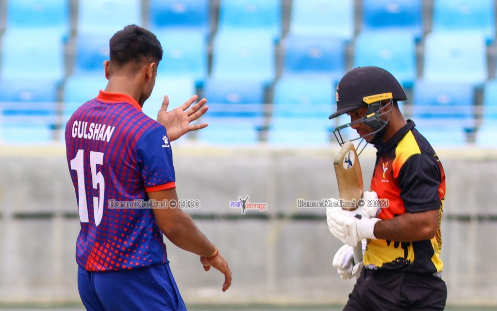 नेपाललाई तीव्र गतिका बलर सोमपाल कामीले पहिलो सफलता दिलाएका थिए । सोमपालले पाँचौं ओभरको पहिलो बलमा पपुवा न्युगिनीका आक्रामण ब्याटर टोनी उरालाई २ रनमा बोल्ड आउट गर्दै पहिलो सफलता दिलाएका थिए । उराले १३ बल खेलेका थिए ।