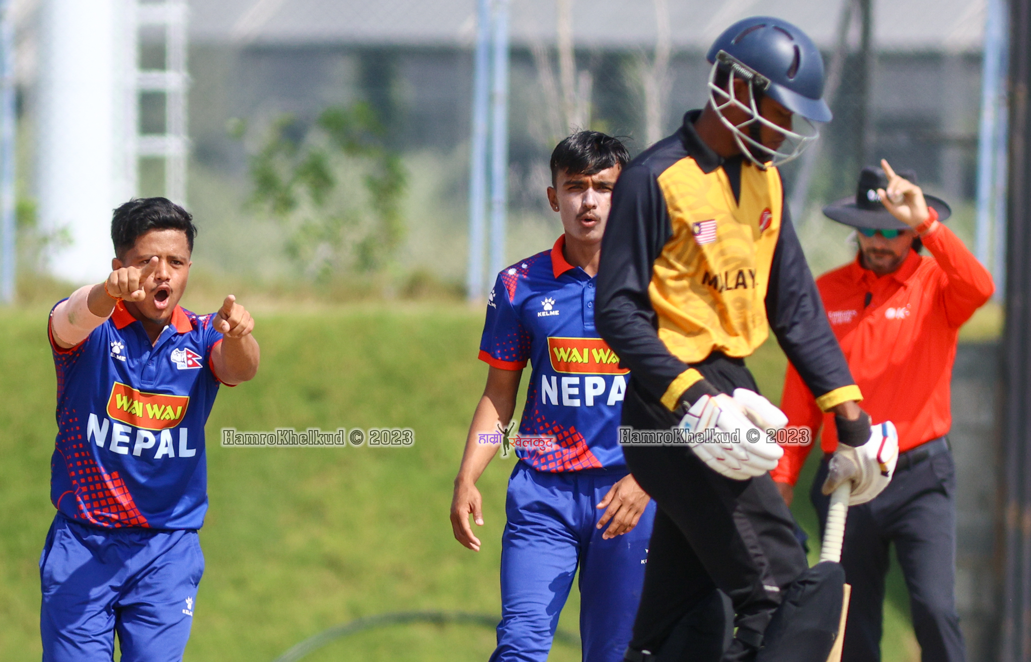 दीपेशले नै सिद्धार्थ निलकण्ठनलाई ३ रनमा स्टम्पिङ आउट गराए । मिलनले शिवनाराण राहुललाई १ रनमा एलबीडब्लू आउट गरे । दीपेशले नै अजरी अजर जामानलाई विकेटकिपर उत्तम थापामगरबाट पाँच रनमा क्याच गराए ।
