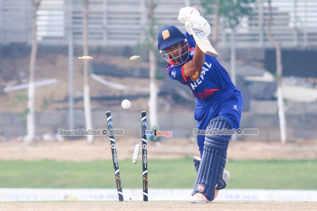 नेपालले पहिलो ओभरमै विकेट गुमायो । ओपनर दीपक बोहरालाई तीव्र गतिका बलर हरित हर्ष सिठ्ठीले बोल्ड आउट गरेका हुन् । चौथो ओभरको पाँचौं बलमा नेपालका ओपनर अर्जुन कुमाल तीन रनमा स्टम्पिङ आउट भएका छन् । स्पिनर हर्षशितको सिठ्ठीको बलमा अर्जुन क्याच आउट हुन पुगेका थिए । क्रिजमा देव खनाल र आकाश त्रिपाठी छन् ।