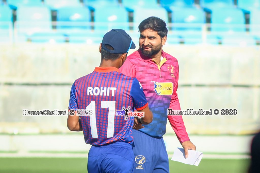 दुबई इन्टरनेशल क्रिकेट स्टेडियममा टसमा वासिम गएका थिए । नेपालका कप्तान रोहित पौडेलले टस जितेर पहिला ब्याटिङ गर्ने निर्णय लिएका छन् । सिपी रिजवानले टस अघि वासिमलाई बधाई दिएका थिए । पपुवा न्युगिनीसँग दुवै खेलमा खराब ब्याटिङ गर्दै १ सय ३१ र पाँच विकेटले पराजित भएपछि युएईले कप्तान परिवर्तन गरेको छ ।