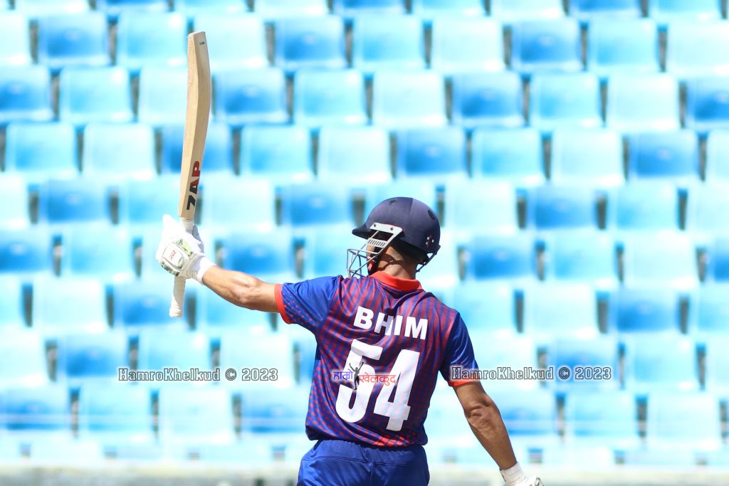 भीमले जहुर खानलाई थर्डम्यानमा चौका हान्दै ७८ बलमा सिनियर टोलीको लागि पहिलो अर्धशतक प्रहार गरेका थिए । भीम ४५ औं ओभरको तेस्रो बलमा रोहन मुस्तफाबाट बोल्ड आउट हुन पुगे । एक समय ६८-५ को दयनीय अवस्थामा पुगेको नेपाललाई भीमले अर्धशतकका साथ खेलमा पुनरागमन गराएका थिए ।