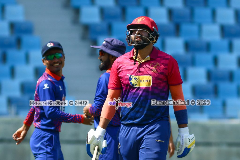 आरिफ शेख ५६ बलमा २ चौका र १ छक्कासहित ४३ रनमा अविजित रहे । युएईका जुनैद सिद्दिकले १० ओभरमा १ मेडनसहित ५३ रन खर्चेर ३ विकेट लिए ।