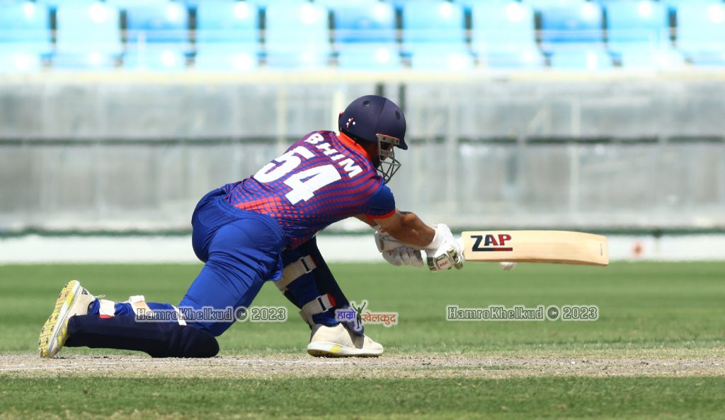 दुबई इन्टरनेशनल क्रिकेट स्टेडियममा टस जितेर पहिला ब्याटिङ रोजेको नेपालले निर्धारित ५० ओभरमा ८ विकेट गुमाउँदै २ सय २९ रन बनाएको थियो । नेपालका भीम सार्कीले ९९ बलमा ७ चौकासहित सर्वाधिक ७० रनको महत्वपूर्ण इनिङ खेलेका थिए । एक समय ६८–५ को दयनीय अवस्थामा पुगेको नेपाललाई भीमले सन्दीपसँग छैटौं विकेटका लागि ५६ रनको साझेदारी गरेका थिए ।