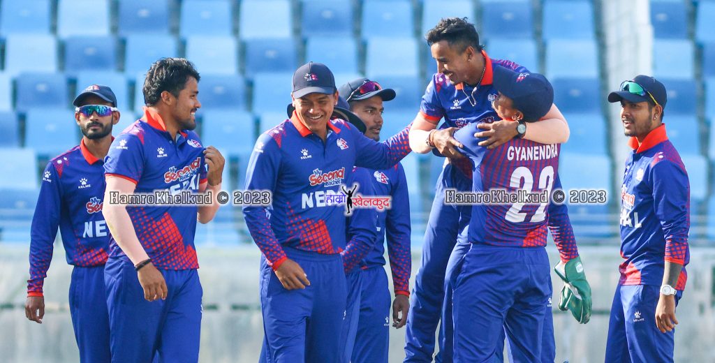रोहित पौडेल (कप्तान), दीपेन्द्रसिंह ऐरी, ज्ञानेन्द्र मल्ल, आसिफ शेख, करण केसी, सोमपाल कामी, कुशल भुर्तेल, ललितनारायण राजवंशी, भीम सार्की, कुशल मल्ल, सन्दीप लामिछाने, गुलशन झा, आरिफ शेख र प्रतिश जि.सी. ।