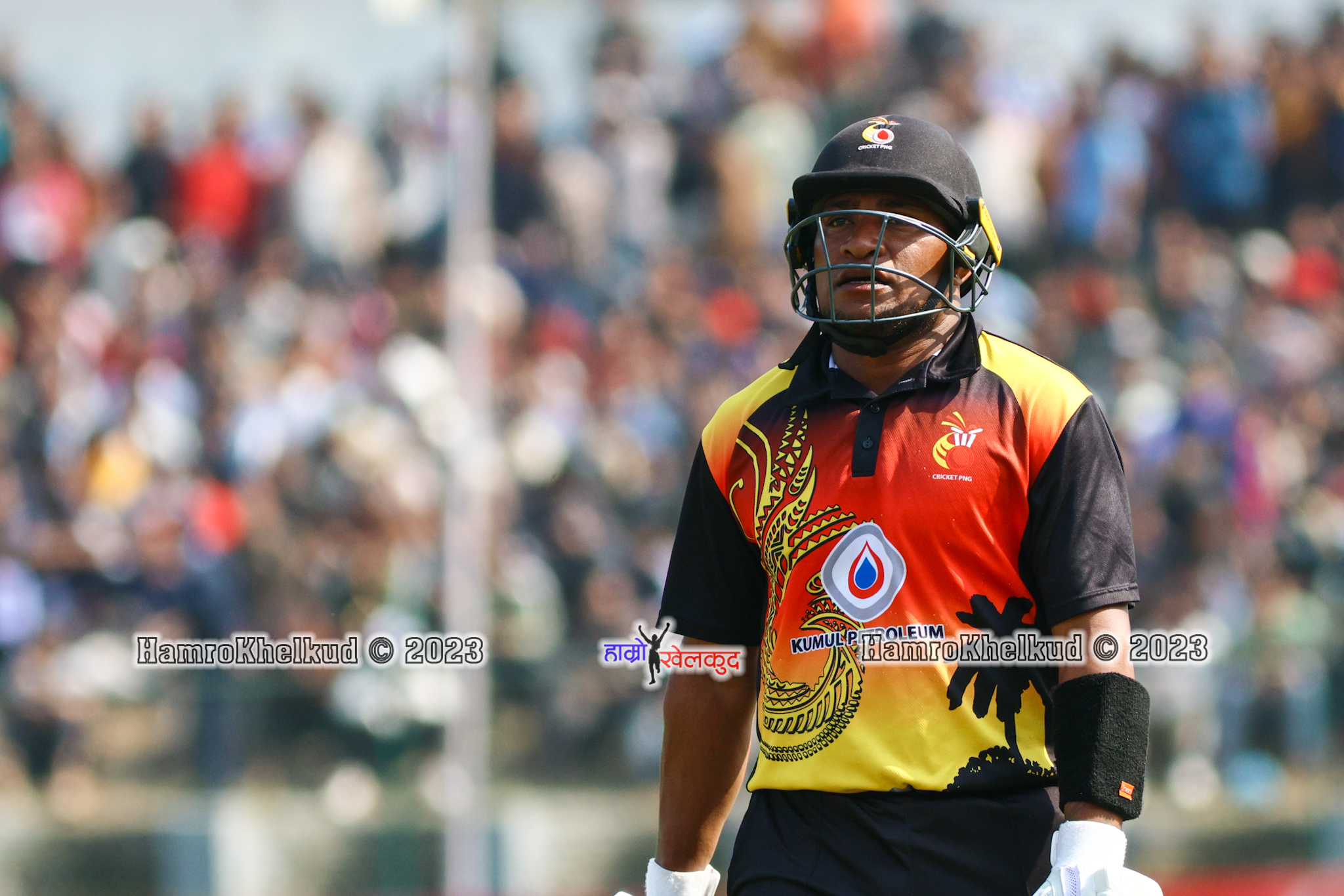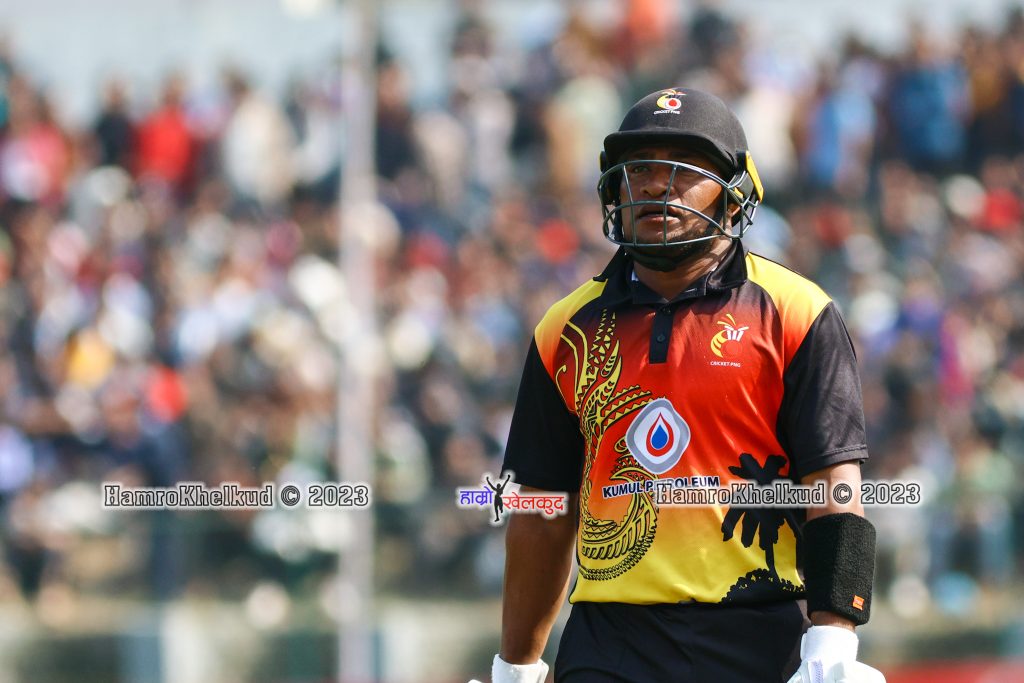 ओपनर आसिफ शेखले १ सय १० बलमा १२ चौका र २ छक्कासहित १ सय १० रनको सानदार शतकीय इनिङ खेले । कुशल भुर्तेल ४५, भीम सार्की ४४ र कप्तान रोहित पौडेलले ३० रन बनाए । पपुवा न्युगिनीका राइली हेकुरेले १० ओभरमा ५० रन खर्चेर ३ विकेट लिए । सेमो कमियाले ९।१ ओभरमा ३८ रन खर्चेर ५ विकेट लिए ।