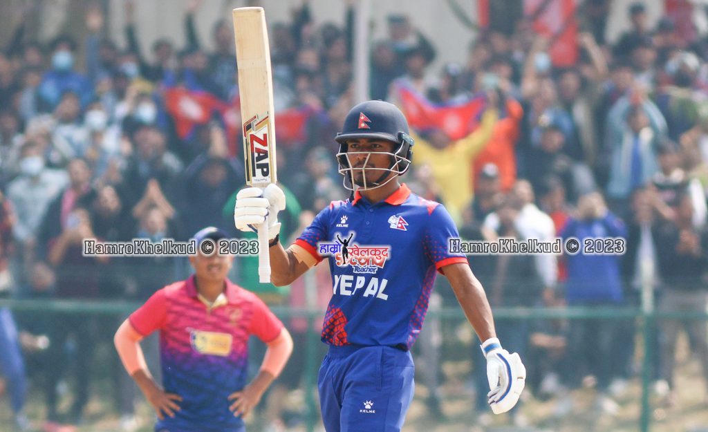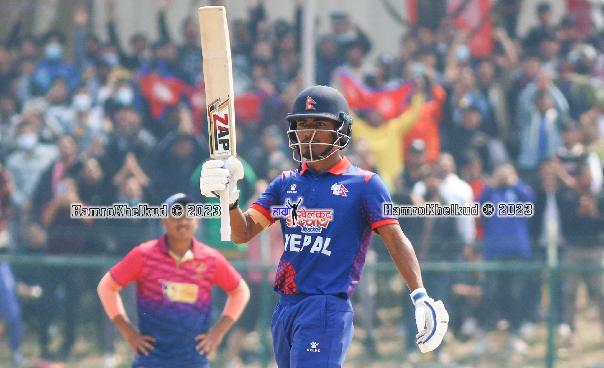 रोहितले ८३ बलमा ७ चौकासहित अर्धशतक पूरा गरेका हुन् । रोहितले आफ्नो ओडिआई करिअरको आठौं अर्धशतक प्रहार गरेका हुन् । रोहित ८५ बलमा ७ चौकासहित ५५ रनमा क्रिजमा छन् । टियु क्रिकेट मैदानमा टस जितेर पहिला ब्याटिङ रोजेको नेपालले ३० ओभरमा ४ विकेट गुमाउँदै १ सय २१ रन बनाएको छ । आरिफ शेख १६ औं रनमा क्रिजमा छन् ।