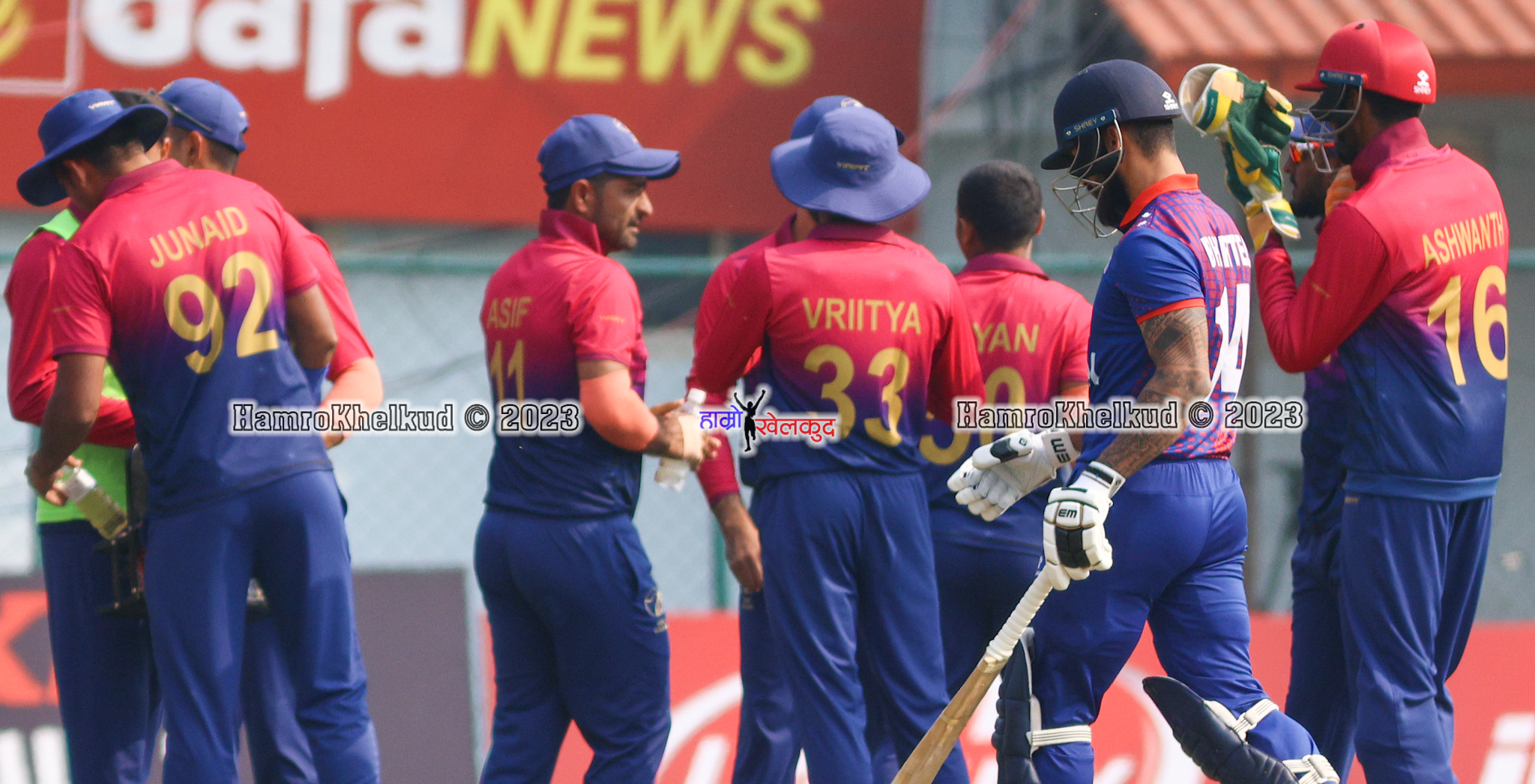 मुस्तफाको २२ औं ओभरको अन्तिम बलमा ठूलो सट खेलेका भीम लङअनमा कार्तिक मपाप्पनबाट क्याच आउट भएपछि साझेदारी तोडिएको थियो । भीमले त्यसअघिको दुई बलमा लगातार दुई चौका हानेका थिए । तेस्रो बाउन्ड्री धुनमा विकेट गुमाउन पुगे ।