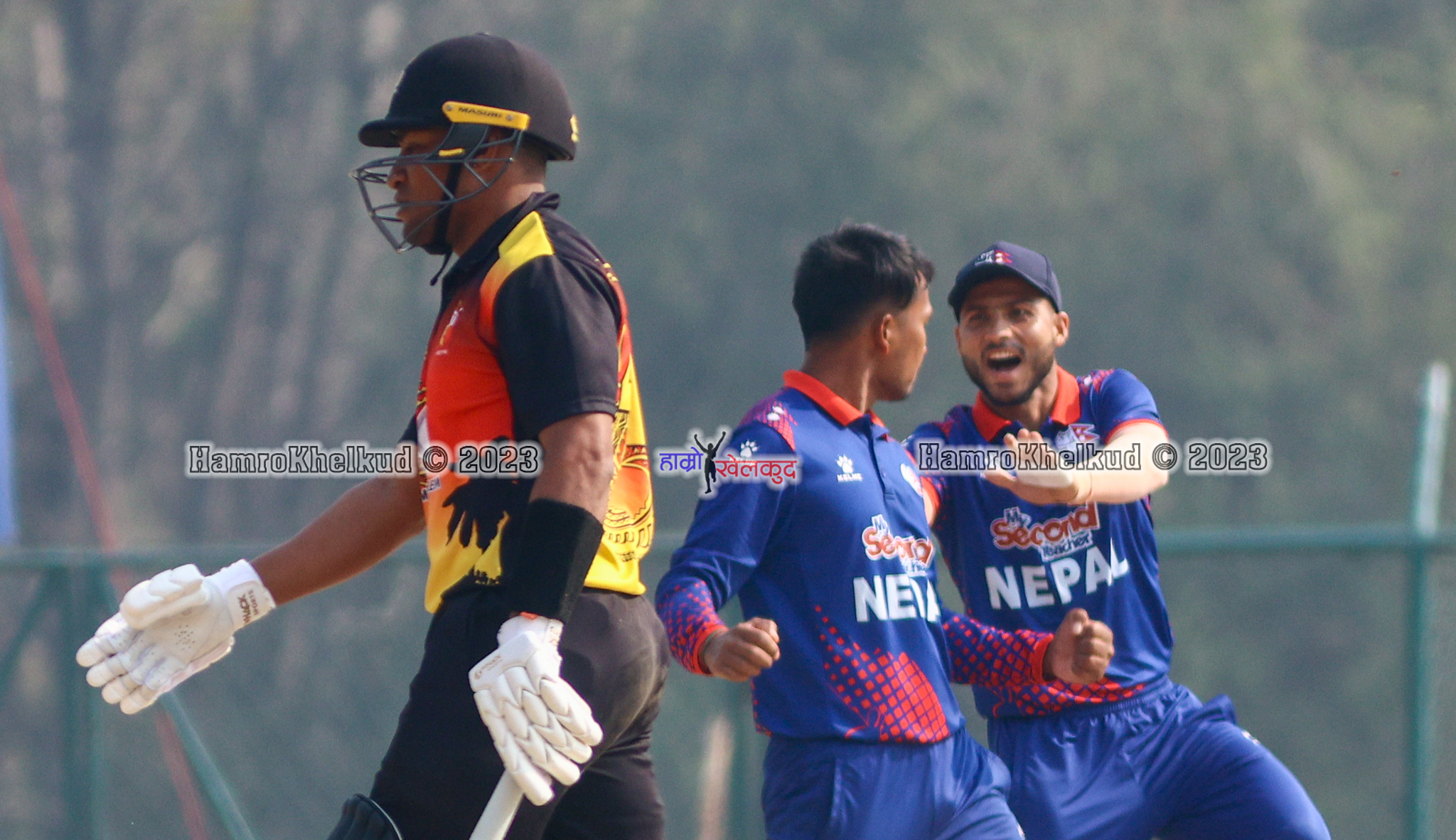चाल्स अमिनी २८ बलमा १ चौकासहित १७ रनमा सन्दीप लामिछानेले क्याच आउट गराए । नेपाललाई बायाँ हाते स्पिनर ललितनारायण राजवंशीले चौथो ओभरको चौथो बलमा ओपनर किप्लिङ डोरिगालाई दुई रनमा बोल्ड गरे ।