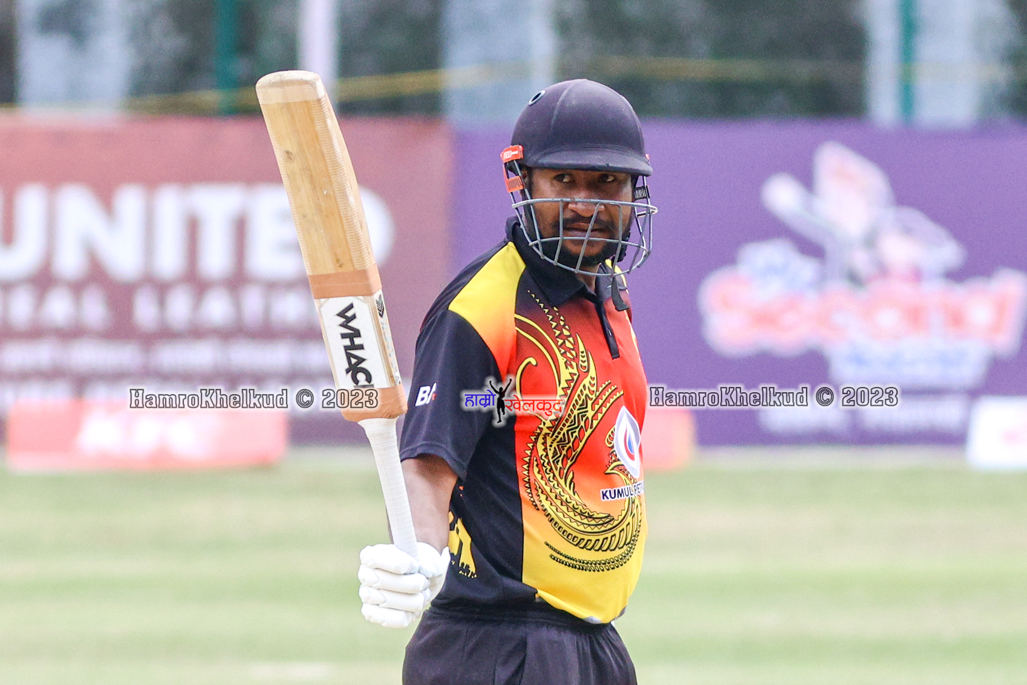 उनले ६० बलमा ३ चौका प्रहार गरे । हजरत बिलालको बलमा सेसे बाउ ९ रनमा क्याच आउट भए । चाल्स अमिनी बिलालकै बलमा एज लागेर २२ रनमा विकेटकिपर वृत्य अरविन्दबाट क्याच आउट भए । उनले ३ चौका प्रहार गरे ।