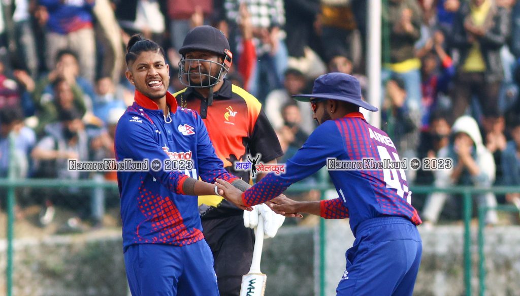 सन्दीपले २०२० मा अमेरिकालाई ३५ रनमा अल आउट गर्न ६ ओभरमा १ मेडनसहित १६ रन खर्चेर ६ विकेट लिएका थिए । जुन प्रदर्शन लिग २ कै सर्वाधिक उत्कृष्ट प्रदर्शन हो । सन्दीपले दुई साता अघि पपुवा न्युगिनीविरुद्ध पाँच विकेट लिएका थिए । सन्दीप भन्दा अघि ओमानका बिलाल खान ३५ खेलमा ७६ विकेट लिँदै शीर्ष स्थानमा रहे ।