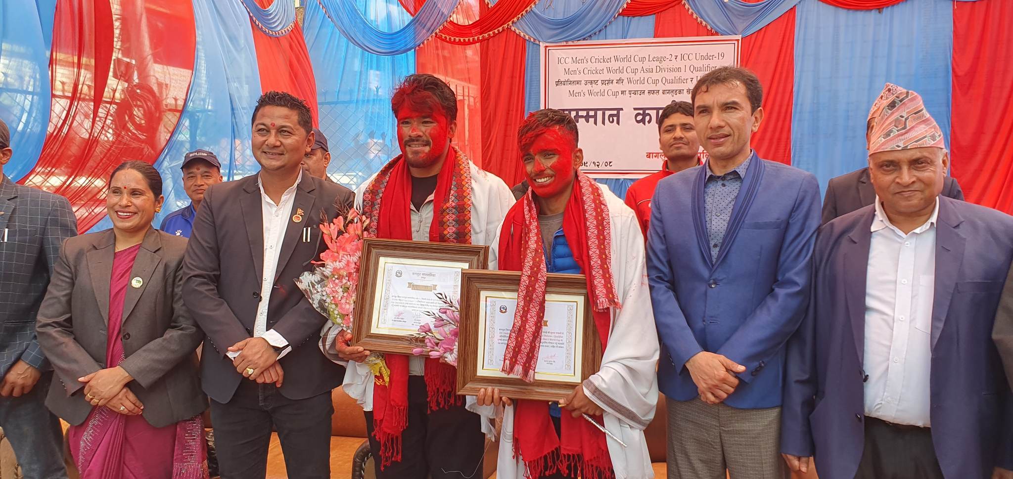 नगरपालिकाले नेपाली क्रिकेटलाई आगमी जुन जुलाईमा जिम्बावेमा हुने विश्वकप छनोटमा पुर्याउन महत्वपूर्ण भूमिका खेल्ने करणलाई १ लाख रुपैयाँले सम्मान गर्यो । त्यस्तै यू-१९ टोलीलाई २०२४ मा श्रीलंकामा हुने विश्वकपमा पुर्याउने सुवासलाई ५० हजार रुपैयाँ नगदसहित सम्मानित गरेको छ ।