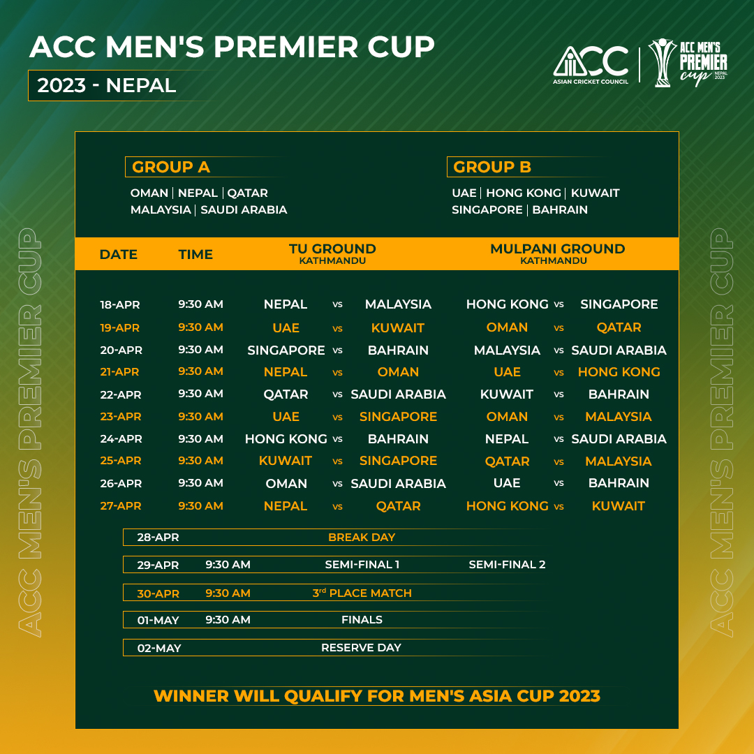 नेपालले पहिलो खेल वैशाख ५ (अप्रिल १८ मा) मलेसियासँग टियु क्रिकेट मैदानमा खेल्दै सुरुवात गर्नेछ । नेपालले दोस्रो खेल वैशाख ८ गते (अप्रिल २१ मा) ओमानसँग टियुमा खेल्नेछ । नेपाल र ओमानबीचको ओडिआई मान्यता हुनेछ । नेपाल र ओमानबीचको खेलले समूह एको विजेता निर्धारण गर्न सक्ने अनुमान गरिएको छ ।