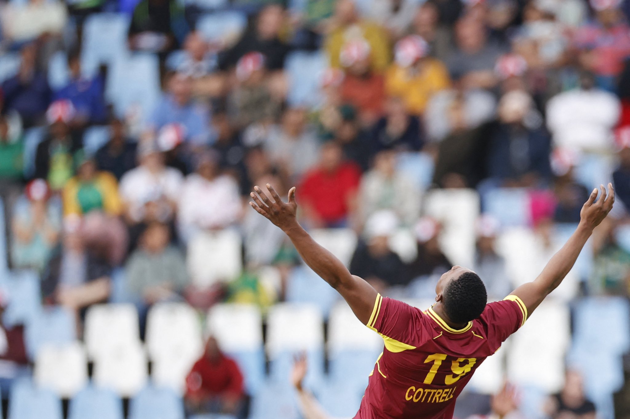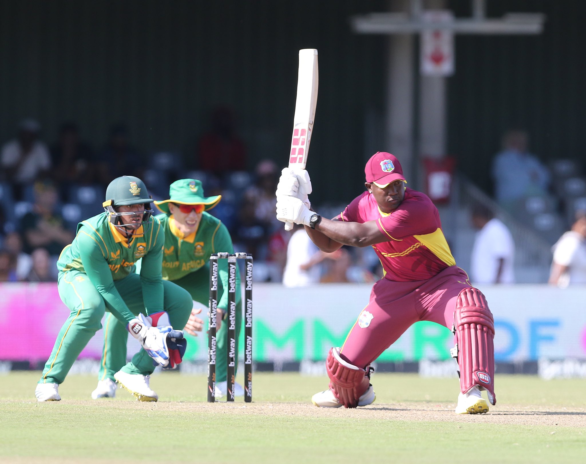 निकोलस पुरन ७ बलमा ३ चौकासहित १६ रनमा आउट भएका थिए । दक्षिण अफ्रिकाका सिसान्डा मगलाले २ ओभरमा २१ रन खर्चेर ३ विकेट लिएपनि टोलीको हार टार्न सकेनन् । तबरेज शम्सी र एनरिच नोर्कियाले एक एक विकेट लिए ।