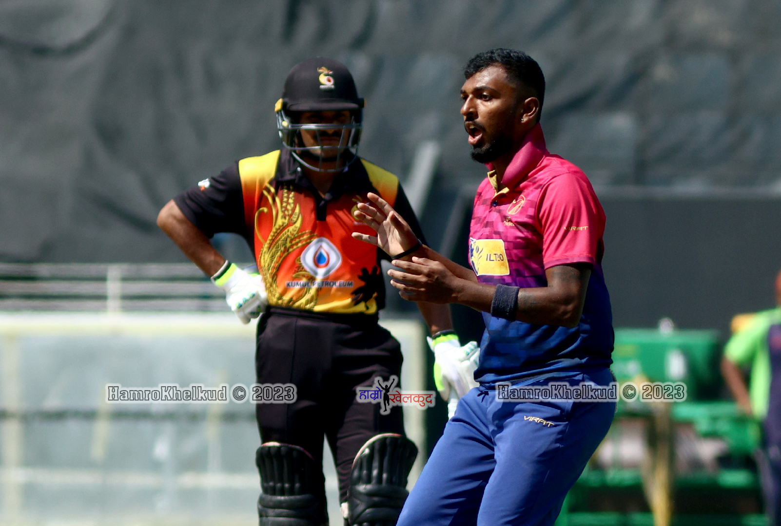 आयन लाक्रा ६ रनमा एलबीडब्लू, वृत्य अरविन्द गोल्डेन डक, रमिज शाहजाद ८ र आसिफ खान ६ रनमा आउट भए । सातौं विकेटका लागि आयन खान र कार्तिक मयाप्पनले ९० रनको सानदार साझेदारी गरे । कार्तिक ३६ बलमा १ चौकासहित २४ रनमा आउट भए ।