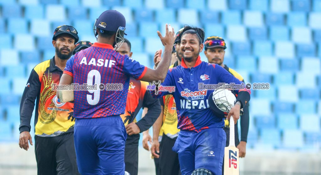 सन्दीप लामिछाने र आसिफ शेखले आठौं विकेटका लागि ७७ रनको अविजित साझेदारी गर्दै जित दिलाएका थिए । उक्त खेलमा आसिफ शेख १ सय ३० बलमा २ चौका र १ छक्कासहित ८६ र सन्दीप ३० बलमा ५ चौकासहित ३५ रनमा अविजित रहँदै नेपाललाई रोमान्चक जित दिलाएका थिए ।