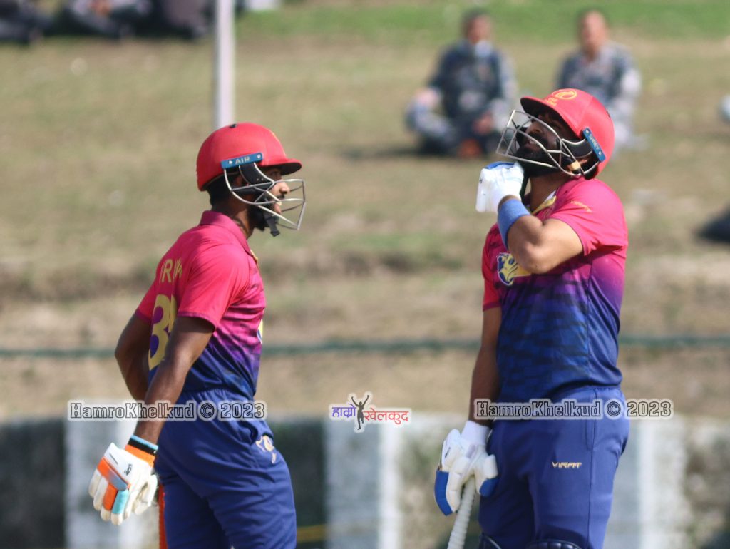 युएईलाई ओपनर आर्यन लाक्रा र वासिमले २८.५ ओभरमा १ सय ३४ रनको शतकीय साझेदारी गरेका थिए । लाक्रा १ सय ९ बलमा २ चौकासहित ५३ रनमा आउट भए । वृत्य अरविन्द २२ बलमा ३ चौकासहित २५ र आसिफ खान ९ रनमा आउट भए ।