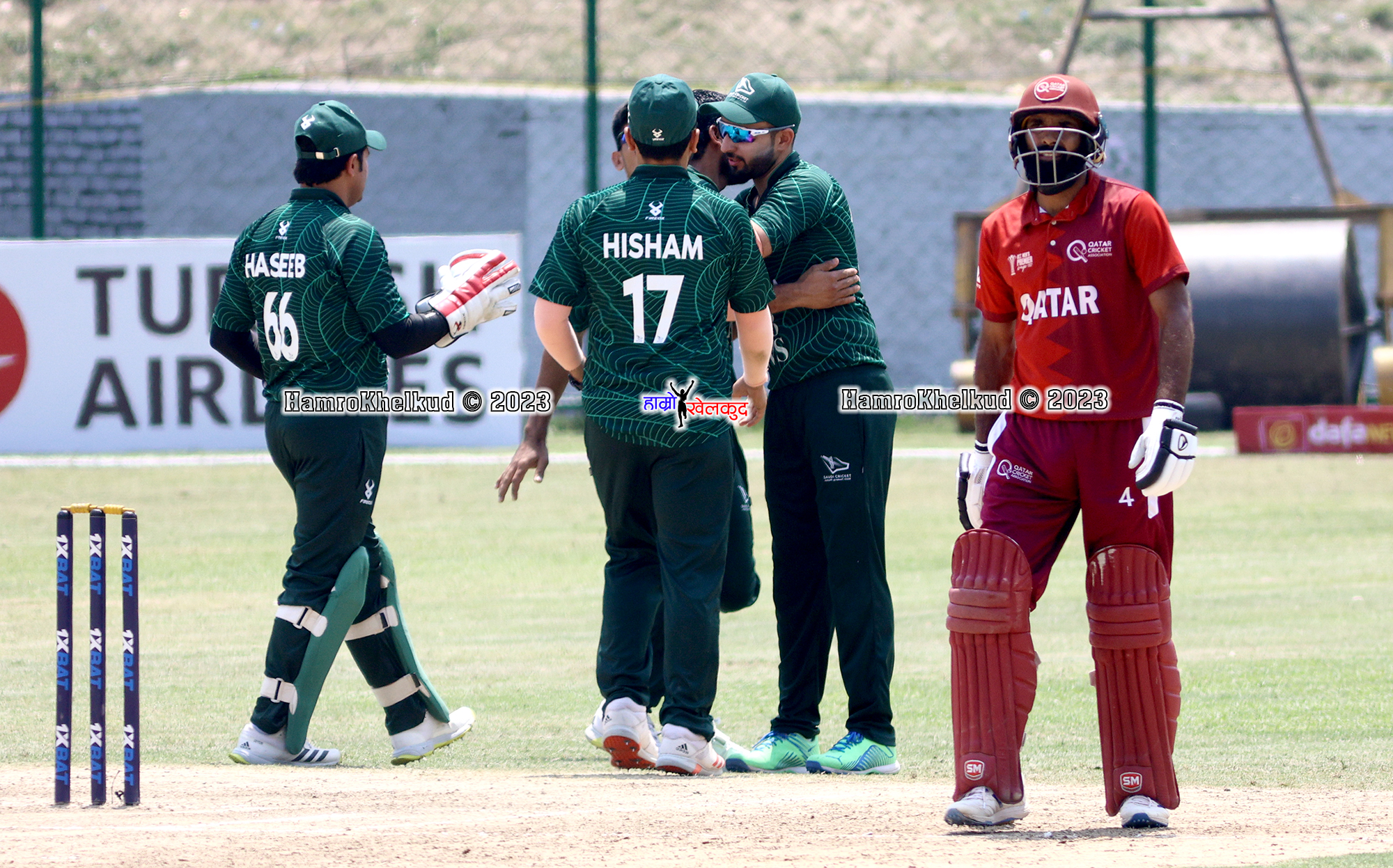 त्यसअघि टियु क्रिकेट मैदानमा टस हारेर पहिला ब्याटिङको निम्तो पाएको कतार ४९.५ ओभरमा २ सय १६ रनमा अल आउट भएको थियो । कतारका मोहम्मद तनविरले ४८ बलमा ७ चौकासहित सर्वाधिक ४६ रन बनाएपनि जितको लागि पर्याप्त हुन सकेन । ओपनर कमरान खान ३९ बलमा ७ चौकासहित ३६ रनमा आउट भए ।