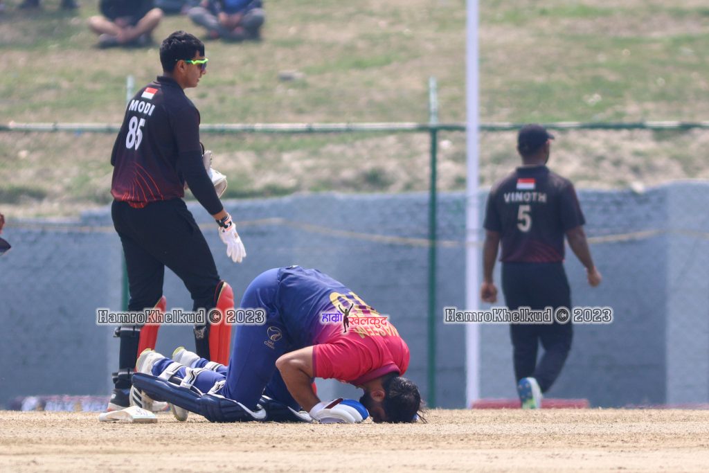 युएईले पहिलो खेलमा कुवेतलाई १ सय ४३ रनले हराएको थियो । दोस्रो खेलमा हङकङसँग डकवर्थ लेविस पद्धतिको आधारमा ६७ रनले पराजित भएको थियो । शीर्ष दुईमा रहँदै सेमिफाइनल रहन बाँकी दुबै खेल जित्नुपर्ने हुन्छ ।युवा ओपनर आर्यन लाक्रा ७ बलमा २ चौकासहित १२ रनमा आउट भए ।