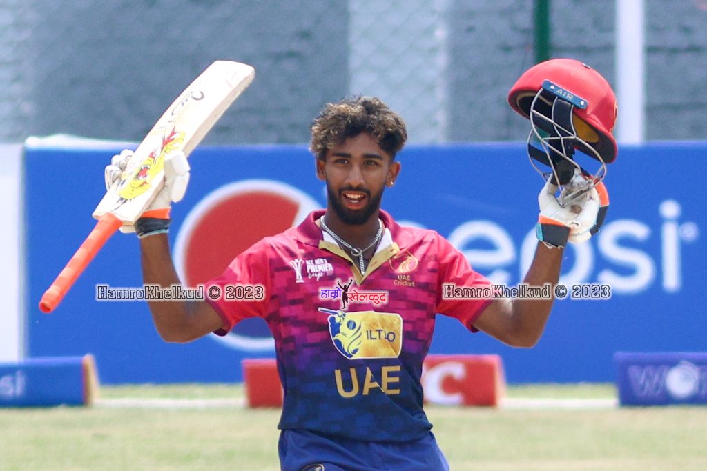 युएईका कप्तान मोहम्मद वासिम ८२ बलमा १ सय ६० रन बनाउँदै आउट थिए । वासिम ८२ बलमा ९ चौका र १६ छक्कासहित १ सय ६० रनमा आउट भएका थिए । उनी आदित्य भर्गवको २८ औं ओभरमा पाँचौं बलमा थर्डम्यानमा मनप्रीत सिंहबाट क्याच आउट भएपछि दोहोरो शतकको अवसर गुमाएका थिए ।