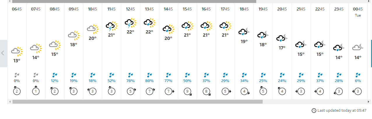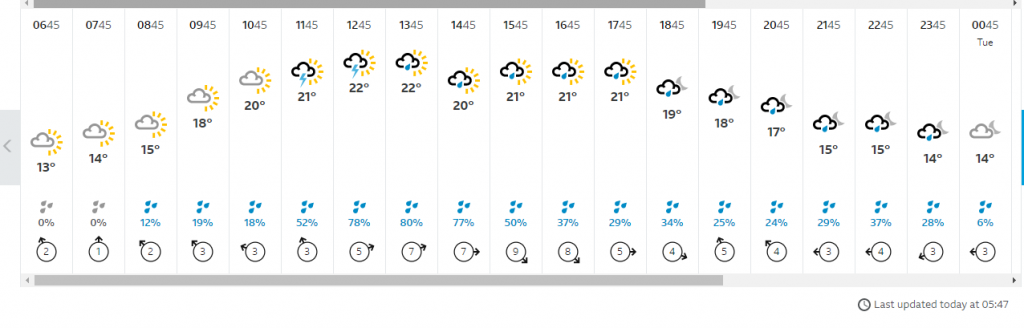 दिउँसो १२ बजेदेखि ३ बजेसम्म ७८ देखि ८० प्रतिशत सम्म वर्षा हुने सम्भावना देखिन्छ । दिउँसो चार बजेपछि विस्तारै घट्दै जानेछ । पूर्वअनुमानका अनुसार आज काठमाडौंमा वर्षा हुने उच्च सम्भावना देखिन्छ । त्यसैको कारण नेपाल र साउदी अरेवियाबीचको खेल प्रभावित हुनसक्नेछ ।