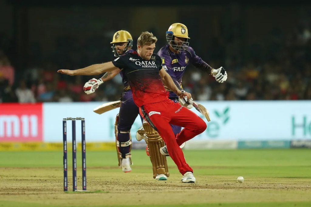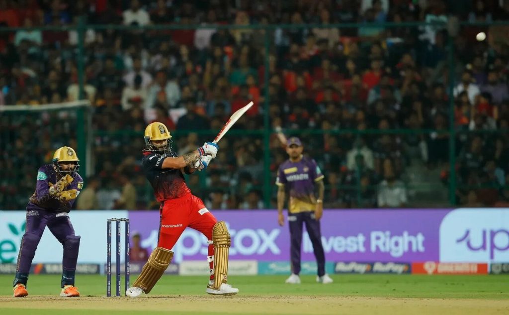 कोहली आन्द्रे रसेलको १३ औं ओभरको पहिलो बलमा विराट कोहली डिप मिडविकेटमा वेंकटेश ऐरबाट क्याच आउट भएपछि जितको सम्भावना कठिन बनेको थियो । फाफ डु प्लेसिस ७ बलमा १ चौका र २ छक्कासहित १७ र ग्लेन म्याक्सवेल ५ रनमा आउट भएपछि दबाबमा परेको थियो ।