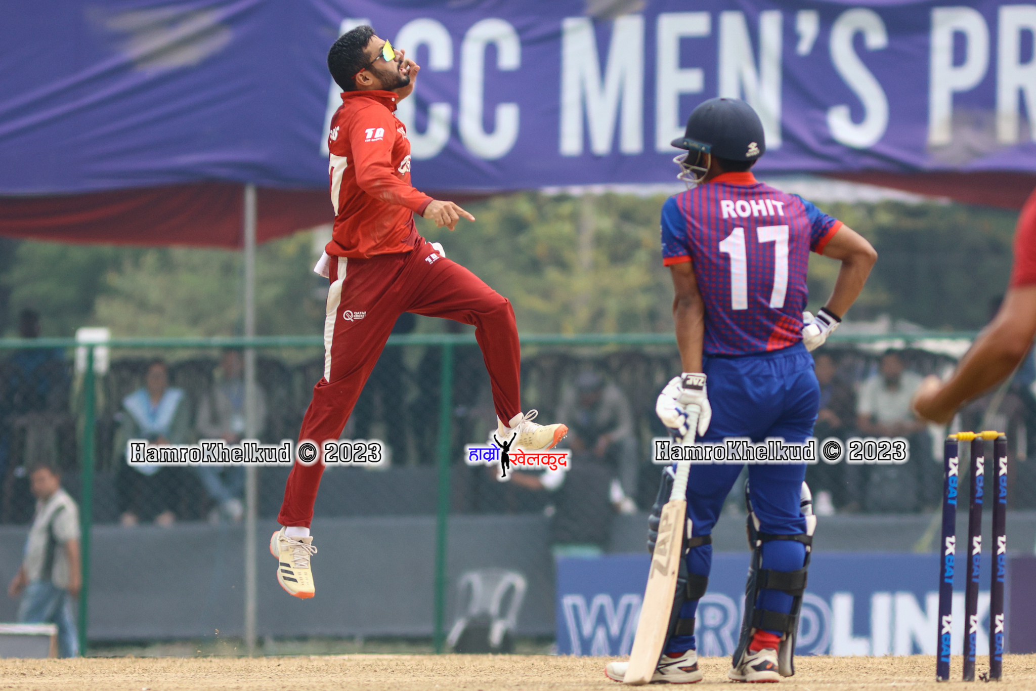 नेपालले आसिफ आउट भएपछि सोमपाललाई ब्याटिङमा पठाएको थियो । कप्तान रोहित पौडेल ३६ बलमा २ चौकासहित २७ रनमा कट बिहाइन्ड हुँदै पेभेलिएन फर्किए । स्पिनर क्वाइस अहमदको १६ औं ओभरको तेस्रो बलमा रोहित कट खेल्ने धुनमा विकेटकिपरबाट क्याच आउट भएका थिए ।