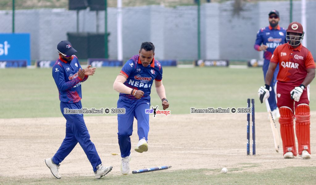 कतारका प्रमुख ब्याटर इमाल लियानागेलाई सोमपाल कामीले छैटौं ओभरको अन्तिम बलमा ६ रनमा बोल्ड आउट गरे । सन्दीप लामिछानेले ओपनर जाहिर इब्राहिमलाई फस्ट स्लिपमा आरिफ शेखबाट १५ रनमा क्याच गराए ।
