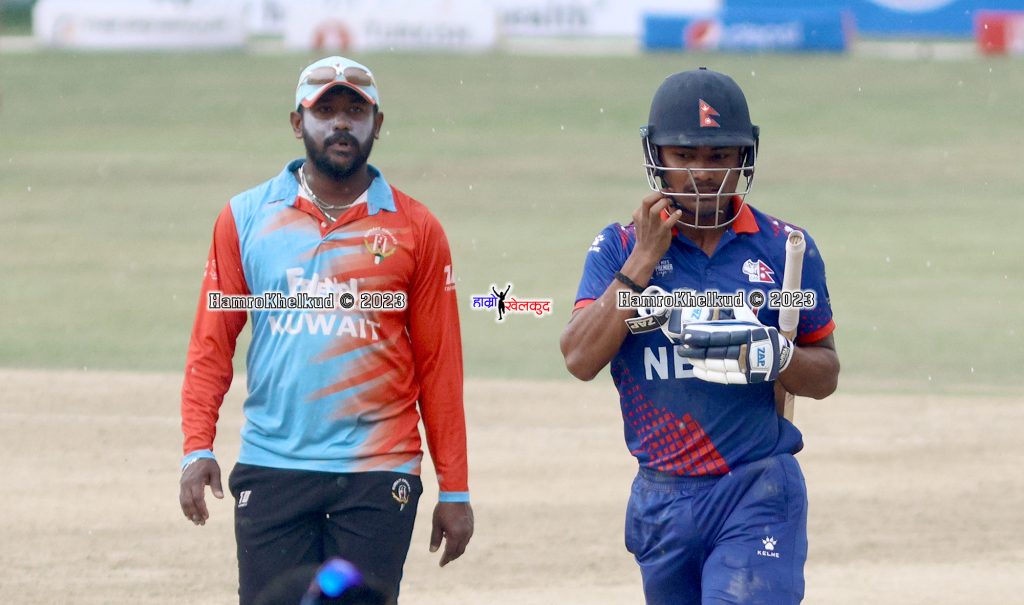 टियु क्रिकेट मैदानमा टस हारेर पहिला ब्याटिङको निम्तो पाएको नेपालले २२.३ ओभरमा ३ विकेट गुमाउँदै १ सय ४१ रन बनाउँदा वर्षाको कारण खेल रोकिएको थियो । नेपालका कप्तान रोहित पौडेल ४० बलमा २ चौकासहित ३० रनमा क्रिजमा छन् । कुशल मल्ल ३० बलमा ४ चौका र १ छक्कासहित ३२ रनमा क्रिजमा छन् ।