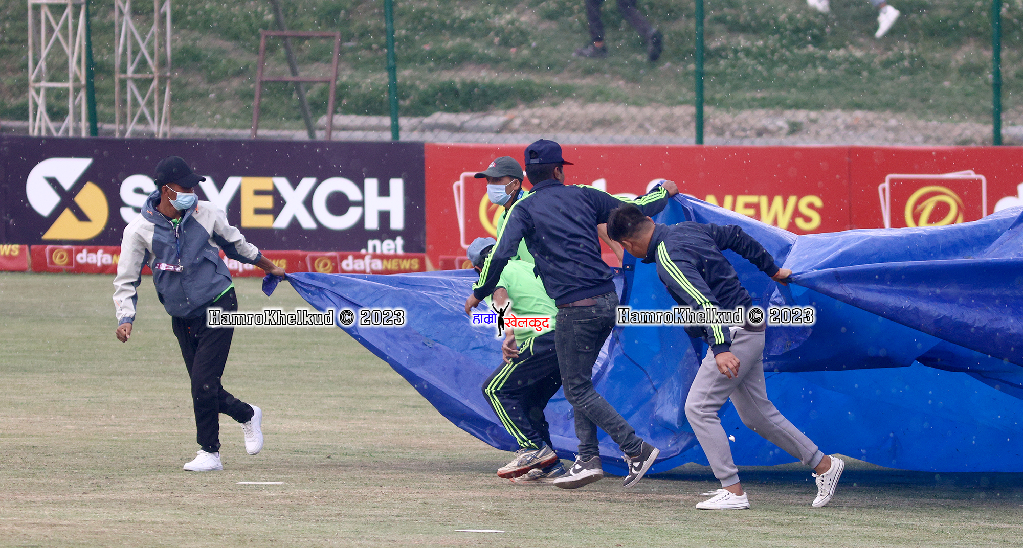 फेरि वर्षा भएपछि पुन पिच कभरले ढाकिएको छ । खेल ढिलो सुरु हुनेछ । टियुमा वर्षा बढेको छ । यदि खेल हुन नसकेको खण्डमा सुपर ओभर हुनेछ । यदि सुपर ओभर पनि हुन सकेन भने नेपाल समूह विजेताको कारण फाइनलमा पुग्नेछ ।