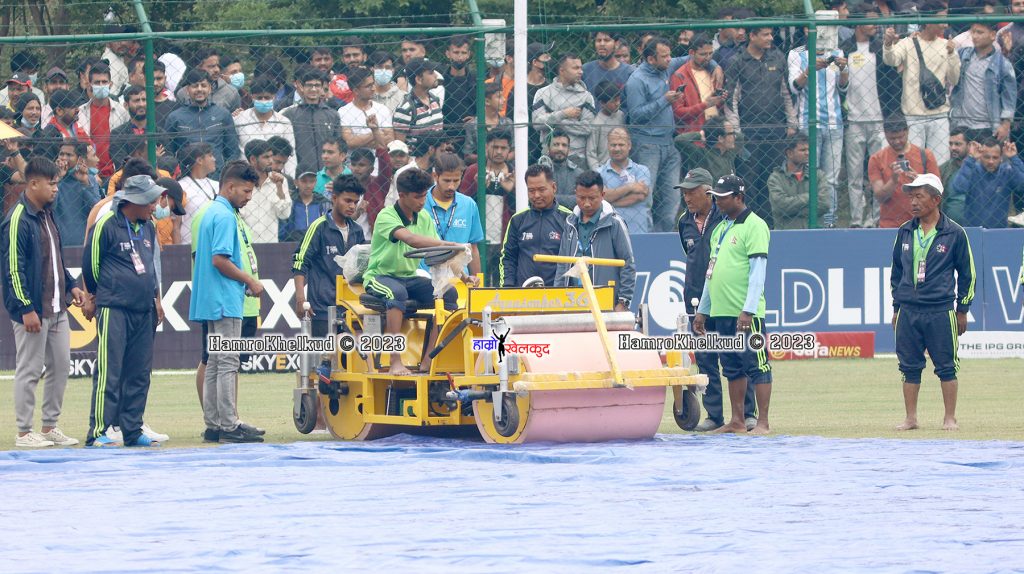 टियु क्रिकेट मैदानमा टस हारेर पहिला ब्याटिङको निम्तो पाएको नेपालले २२.३ ओभरमा ३ विकेट गुमाउँदै १ सय ४१ रन बनाउँदा वर्षाको कारण खेल रोकिएको थियो । नेपालका कप्तान रोहित पौडेल ४० बलमा २ चौकासहित ३० रनमा क्रिजमा छन् । कुशल मल्ल ३० बलमा ४ चौका र १ छक्कासहित ३२ रनमा क्रिजमा छन् ।