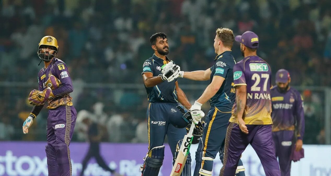 डेविड मिलर १८ बलमा २ चौका र २ छक्कासहित ३२ रनमा अविजित रहे । ओपनर शुभमन गिल ३५ बलमा ८ चौकासहित ४९, ऋद्धिमान शाह १० र हार्दिक पान्ड्या २६ रनमा आउट भए । कोलकाताका हर्षित राना, आन्द्रे रसेल र सुनिल नारायणले समान एक विकेट लिए ।
