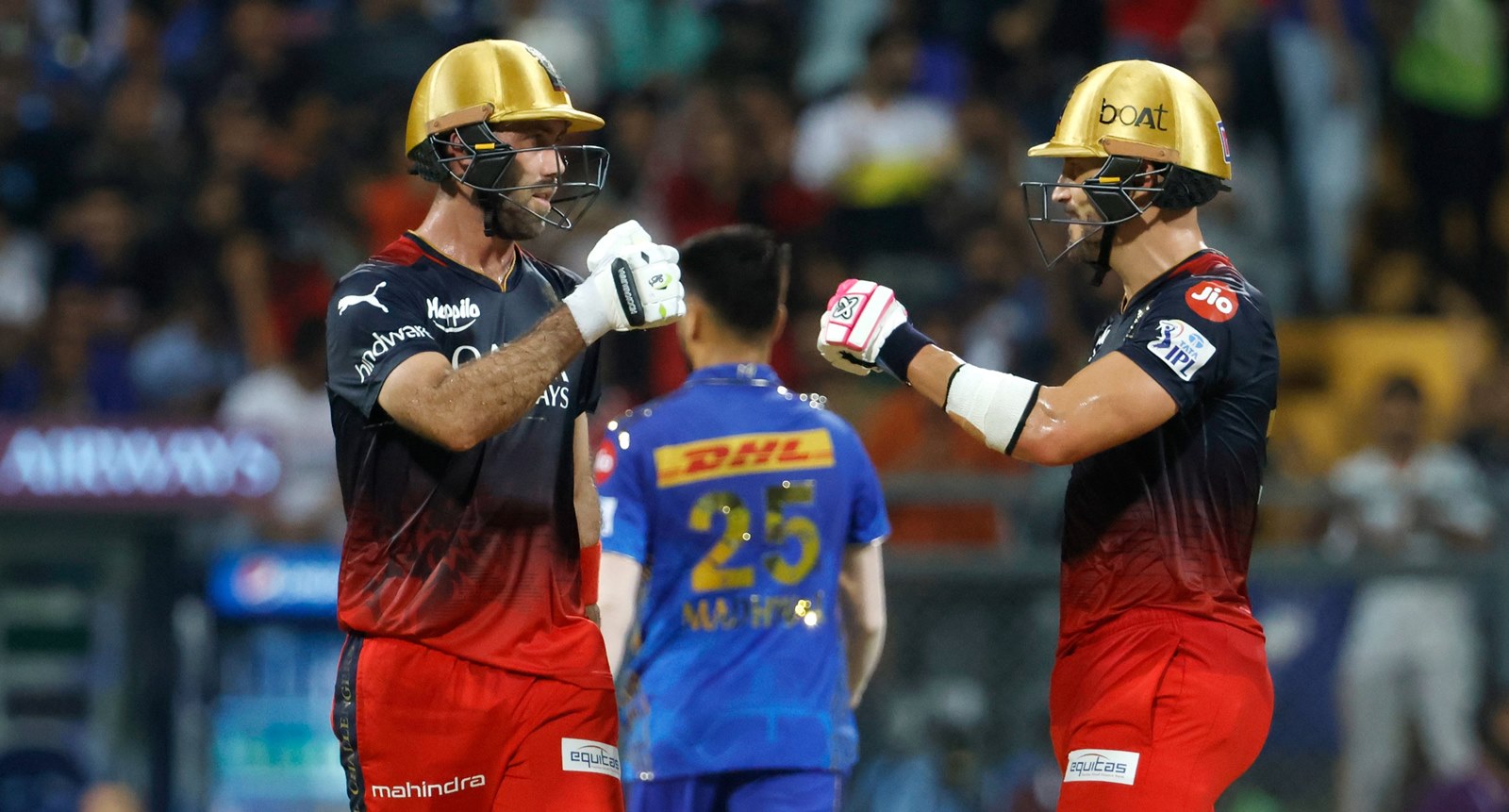 टस जितेर फिल्डिङ रोजेको मुम्बईले पहिलो ओभरमा मुख्य ब्याटर विराट कोहलीको विकेट लिएको थियो । कोहलीलाई १ रनमै आउट गरेका जेसन बेह्रेनडर्फले अर्को ओभरमा अनुज रावतलाई पनि पेभेलियन फर्काए । तर त्यसपछि तेस्रो विकेटका दुई विदेशी ब्याटरले १ सय २० रनको साझेदारी गर्दा बेंगलोरले खेलमा पकड जमायो । १३ औं ओभरमा आउट हुनुअघि म्याक्सवेलले ३३ बलमा ६८ रन जोडे । ८ चौका र ४ छक्का प्रहार गरेका म्याक्सवेल बेह्रेनडर्फकै बलमा ठूलो सट खेल्ने धुनमा डिप मिडविकेटमा आउट भए ।