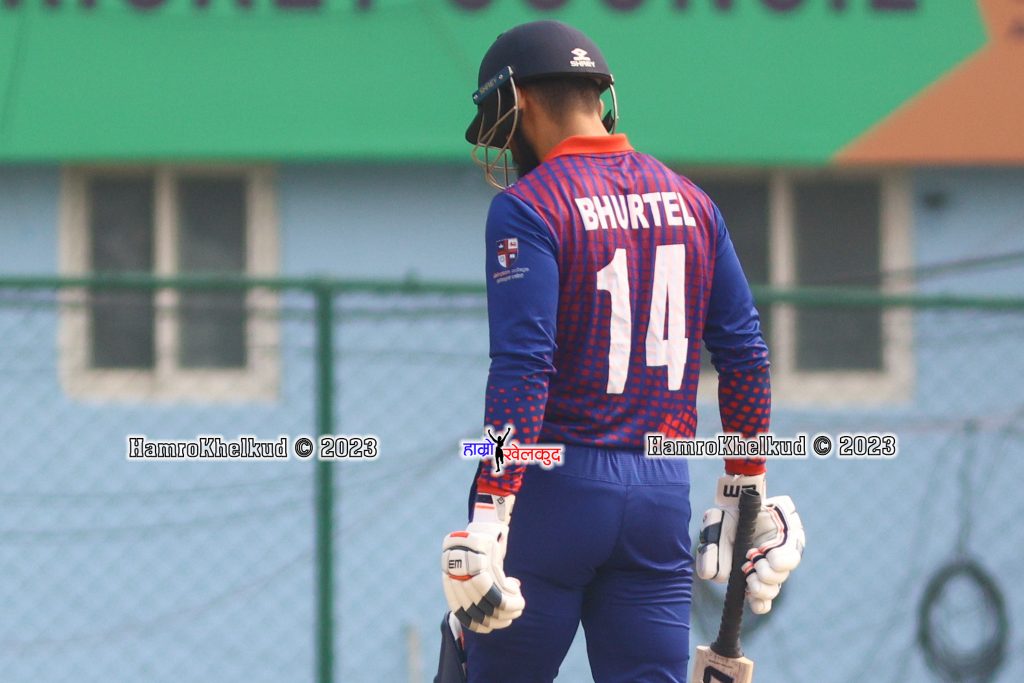 कुशल भुर्तेल ४२ बलमा २ चौकासहित २७ रनमा आउट भएका छन् । तीव्र गतिका बलर विक्रमजित सिंहको १४ औं ओभरको पाँचौं बलमा कट खेल्ने धुनमा कुशल विकेटकिपर स्कर्ट एडवाडर््सबाट क्याच आउट भए । नेपालका भीम सार्की ४५ बलमा १४ र आरिफ शेख ३ रनमा नट आउट छन् ।