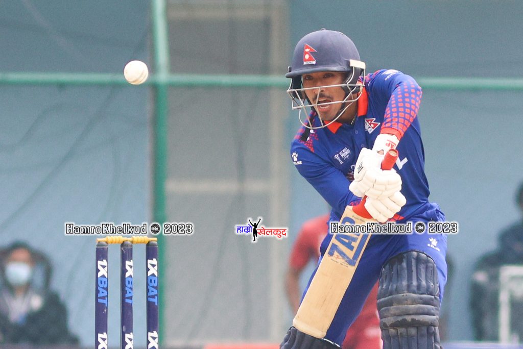 प्रतिश २४ बलमा १ चौका र २ छक्कासहित २६ रनमा क्याच आउट भए । सोमपालले अन्तिम विकेटका लागि ललित नारायण राजवंशीसँग ४९ रनको साझेदारी गरेका थिए । ललित १० बलमा एक रनमा नट आउट रहे ।
