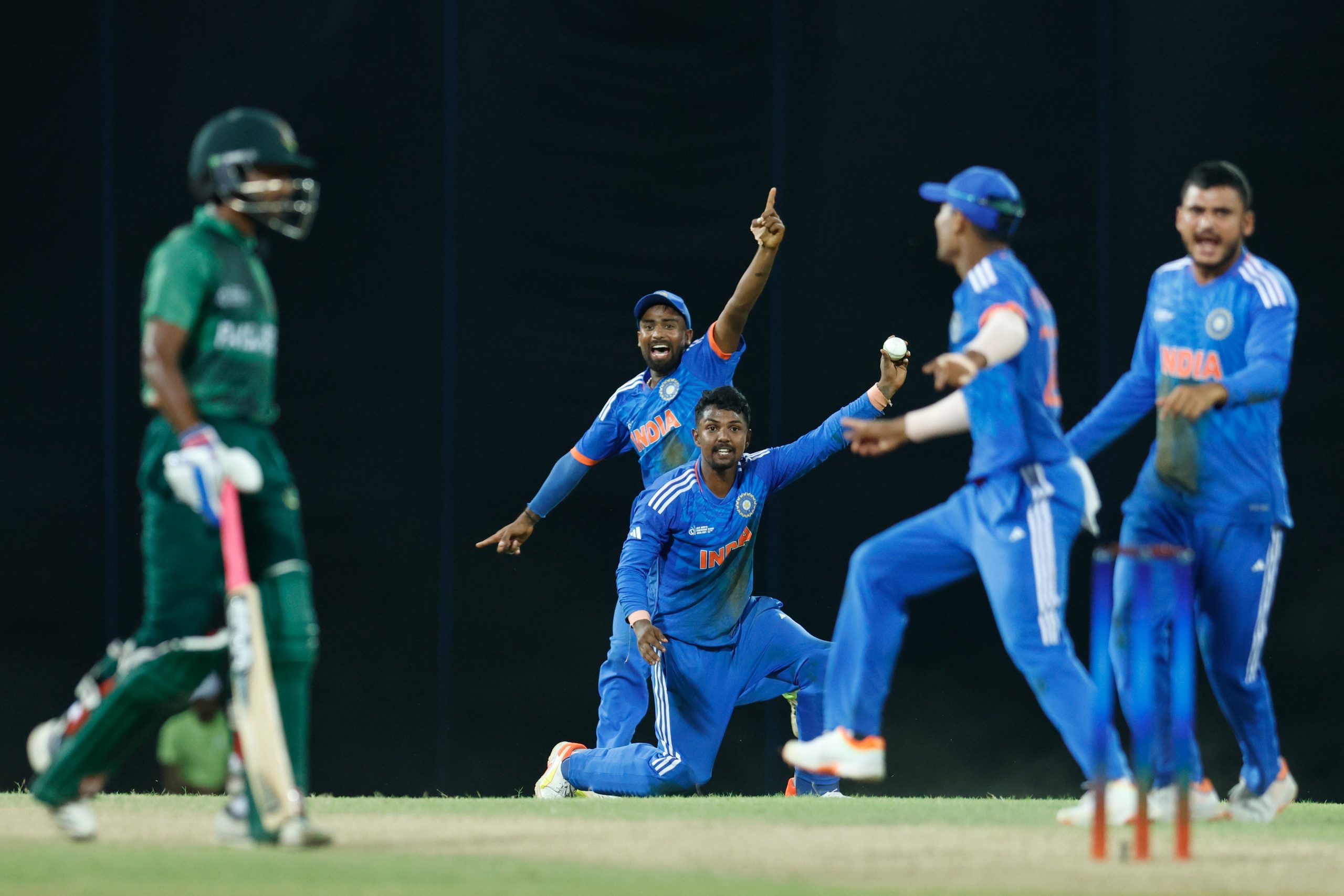 भारतका निशान्त सिन्धुले ८ ओभरमा २० रन खर्चेर ५ विकेट लिए । मानव सुथारले ८.२ ओभरमा ३२ रन खर्चेर ३ विकेट लिए । अभिषेश शर्माले एक विकेट लिए ।