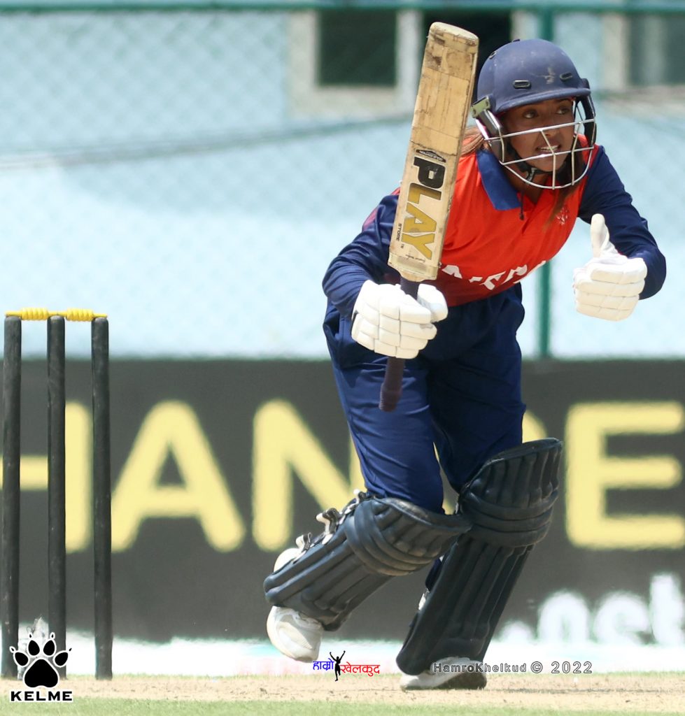 वर्षाको कारण खेल केहि समय प्रभावित हुँदा १८-१८ ओभरको हुनेछ । ओपनर पुजा महतो भने पहिलो ओभरको पाँचौं बलमा ऐना हामिजाह हासिमको बलमा एक रनमा एलबीडब्लू आउट भइन् । काजोल श्रेष्ठ २१ बलमा १ चौकासहित १८ रनमा आउट भइन् ।