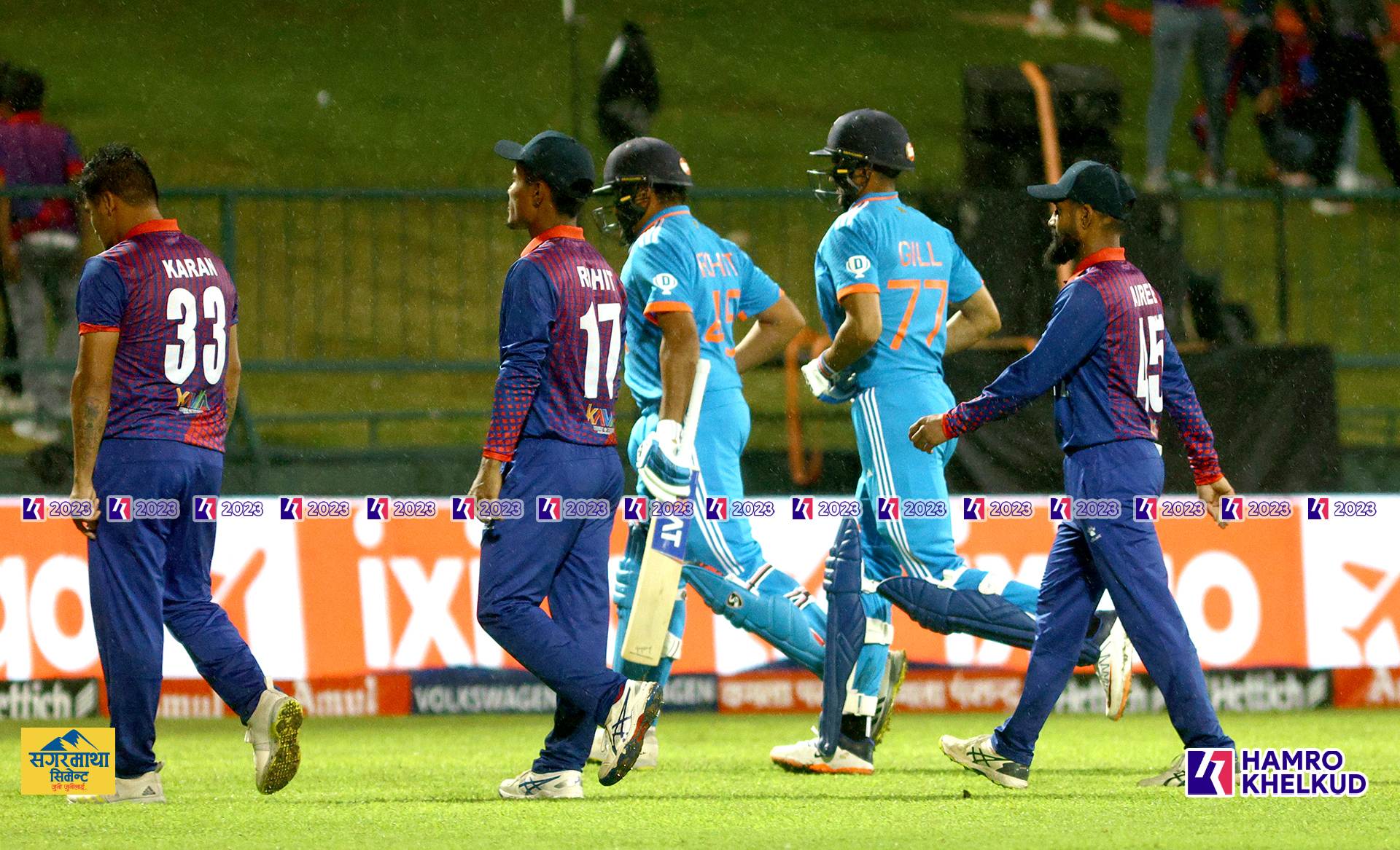 पालेकेले इन्टरनेशल क्रिकेट स्टेडियममा नेपालले दिएको २ सय ३१ रनको विजयी लक्ष्य पछ्याएको भारतले २.१ ओभरमा १७ रन बनाउँदा वर्षाको कारण खेल रोकिएको छ । शुभमन गिल ६ बलमा ३ चौकासहित १२ रनमा क्रिजमा छन् । रोहित शर्मा ७ बलमा १ चौकासहित ४ रनमा क्रिजमा छन् ।