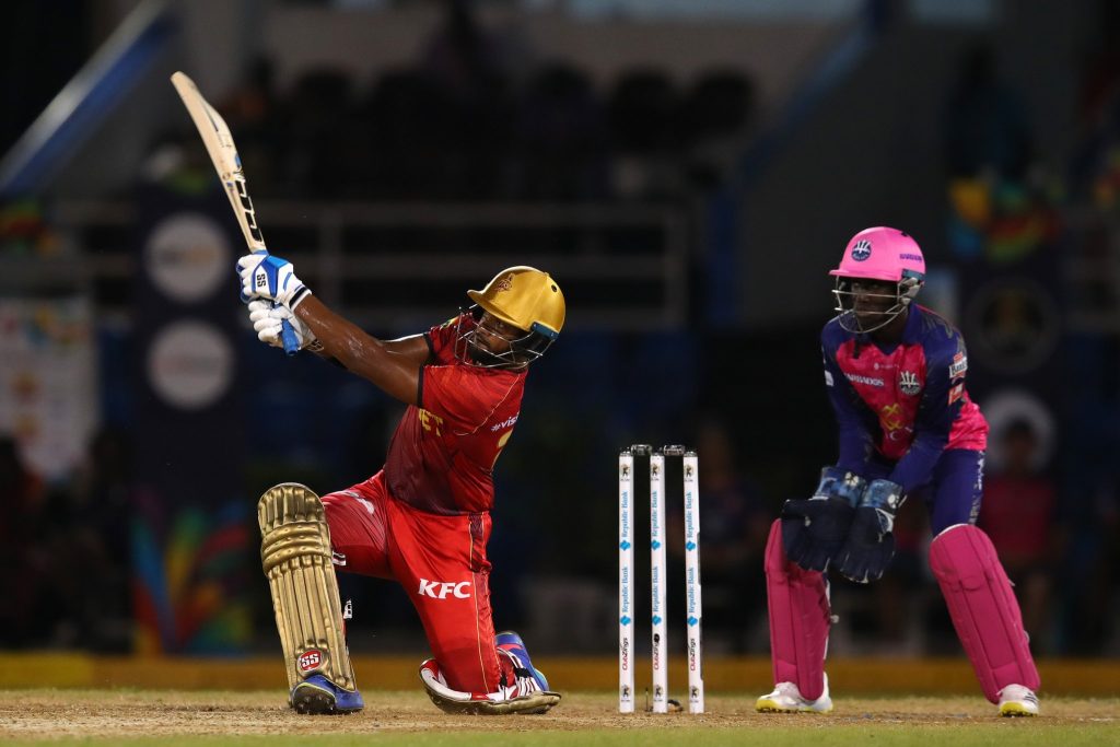 आन्द्रे रसेल २२ बलमा २ चौका र ४ छक्कासहित ३९ रनमा आउट भए । ओपनर मार्टिन गुप्टिल ३७, मार्क दयाल ६, काइरन पोलार्ड २ र लोर्कान टकर ८ रनमा आउट भए । रोयल्सका ओबेद म्याककोयले ४ ओभरमा ३९ रन खर्चेर २ विकेट लिए । कायल मेयर्स, क्वाइस अहमद र रहकीम कर्नवालले एक एक विकेट लिए ।