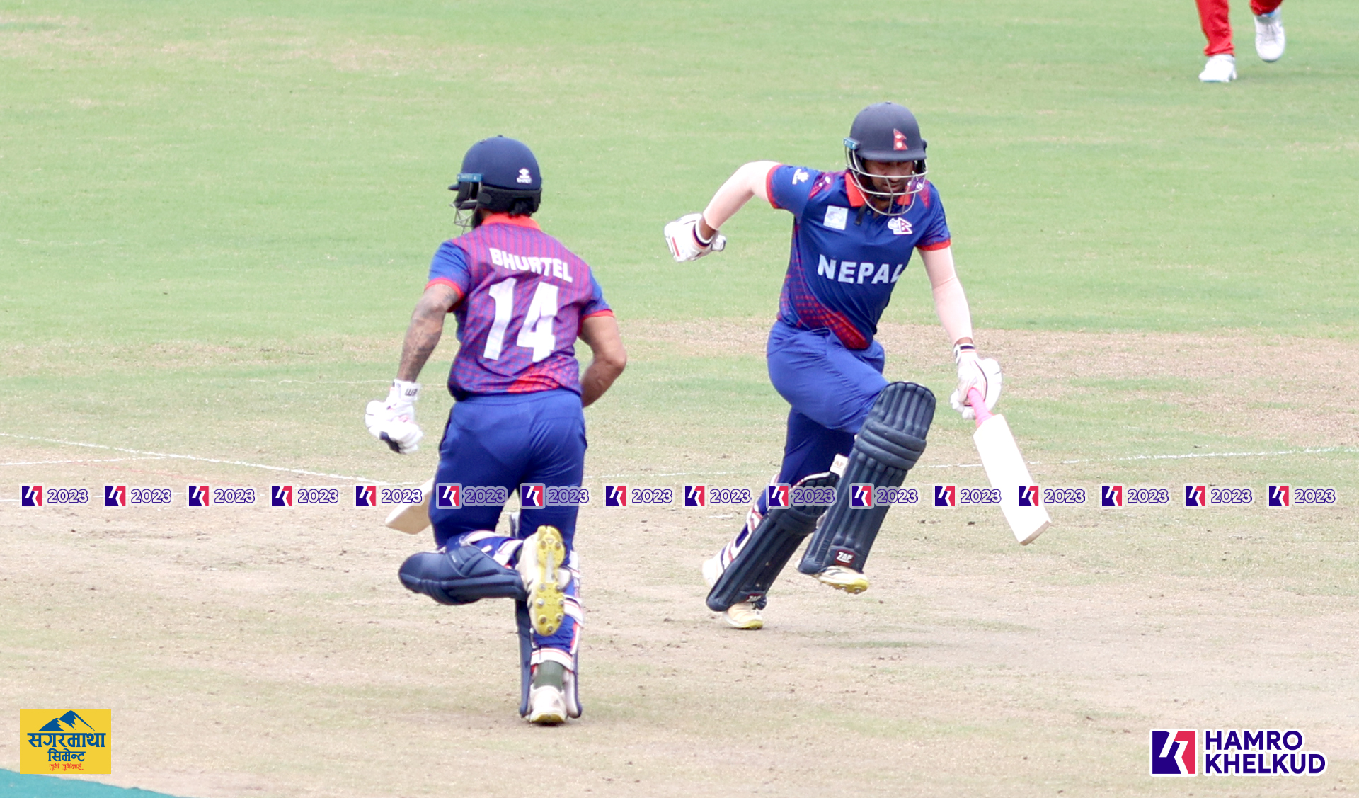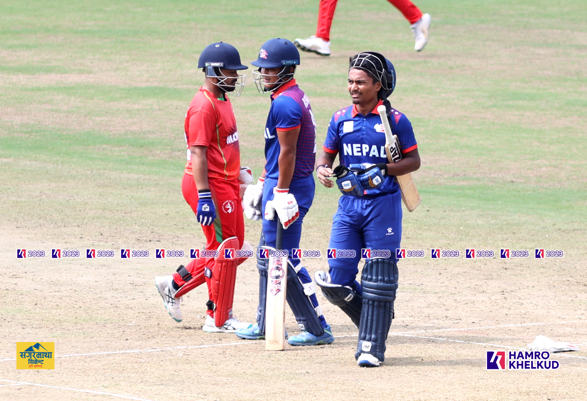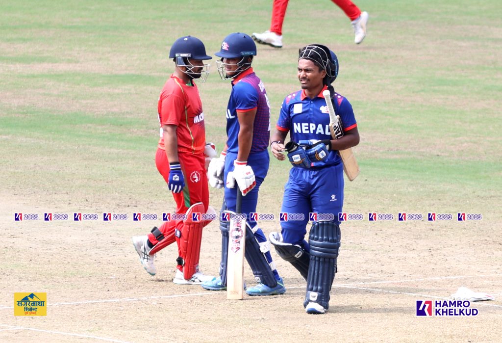 नेपालका कप्तान रोहित पौडेलले २७ बलमा ३ चौका र ३ छक्कासहित सर्वाधिक ५२ रन बनाए । कुशल मल्ल २० बलमा ३ चौका र ३ छक्कासहित ४७ रनमा नटआउट रहे । दीपेन्द्र ६ रनमा आउट हुँदा सोमपाल कामी एक बलमा एक रन बनाए ।