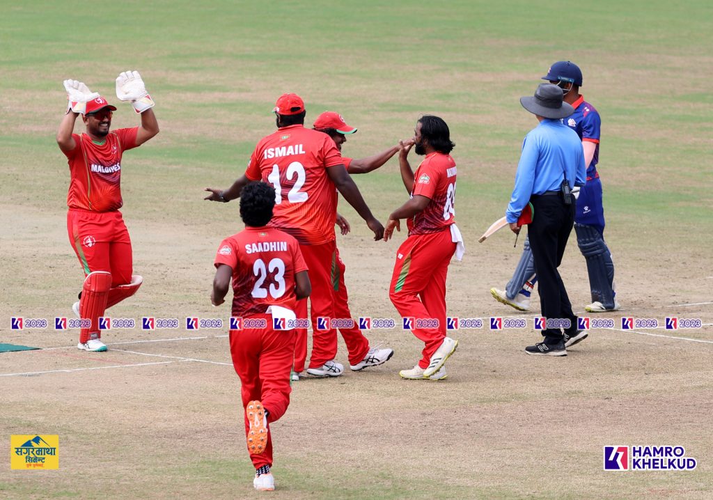 पाँचौं विकेटका लागि गुलशन झा र रोहित पौडेलले ७० रनको साझेदारी गरेका थिए । गुलशन २१ बलमा १ चौका र ३ छक्कासहित ३५ रनमा आउट भए । माल्दिभ्सका बदिउ इस्माइल नवाजले ४ ओभरमा १७ रन खर्चेर सर्वाधिक ३ विकेट लिए ।