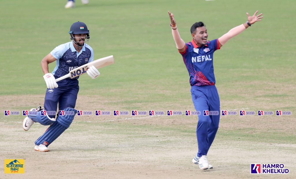 मंगोसिया र माल्दिभ्सविरुद्ध सानदार प्रदर्शन गरेका दुई प्रमुख ब्याटर रोहित र कुशल मल्ल क्रिजमा थिए । तर ११ औं ओभरमा स्पिनर रवि विश्रोई कुशल मल्ल र रोहित पौडेललाई आउट गर्दै नेपालबाट जित टाढा बनाएका थिए ।